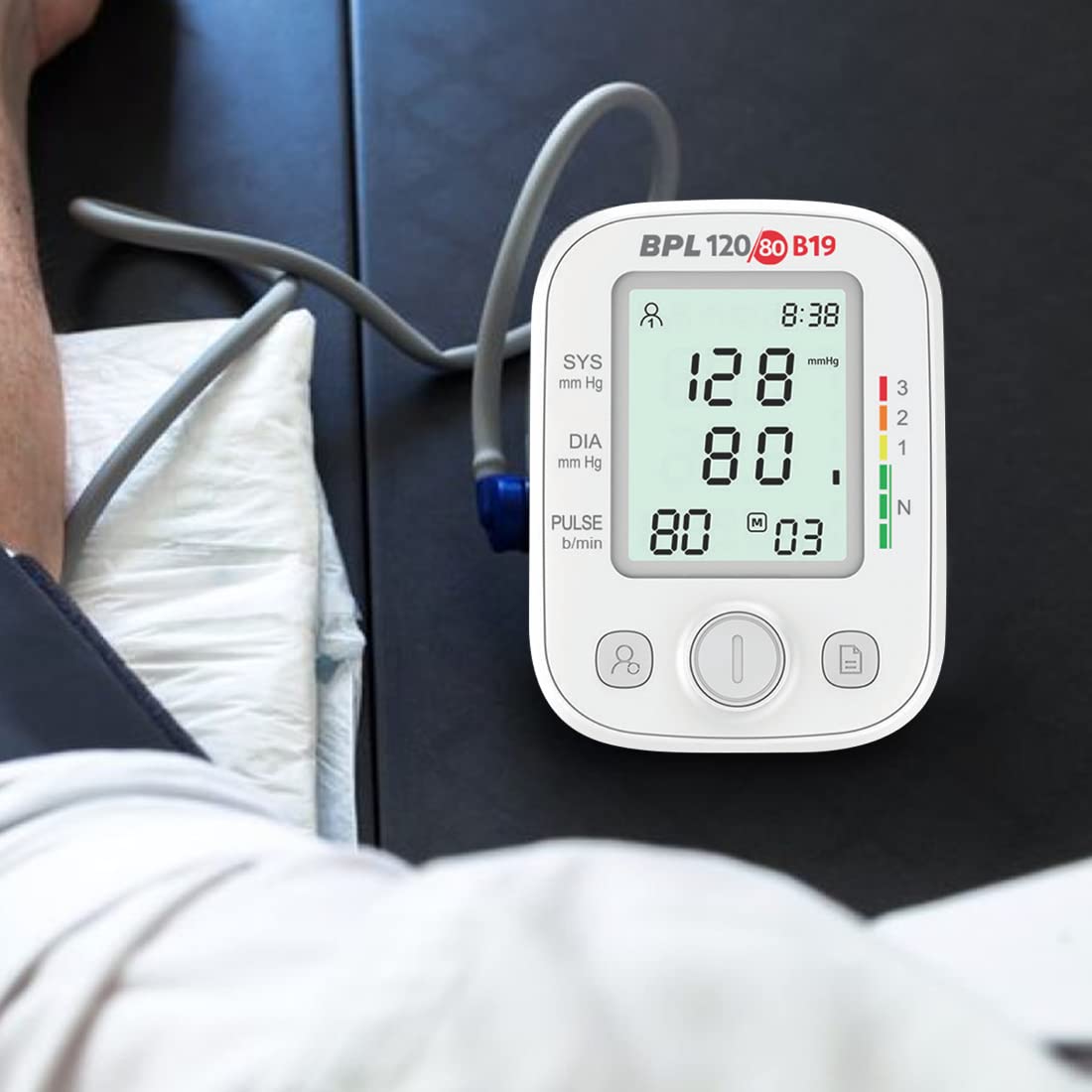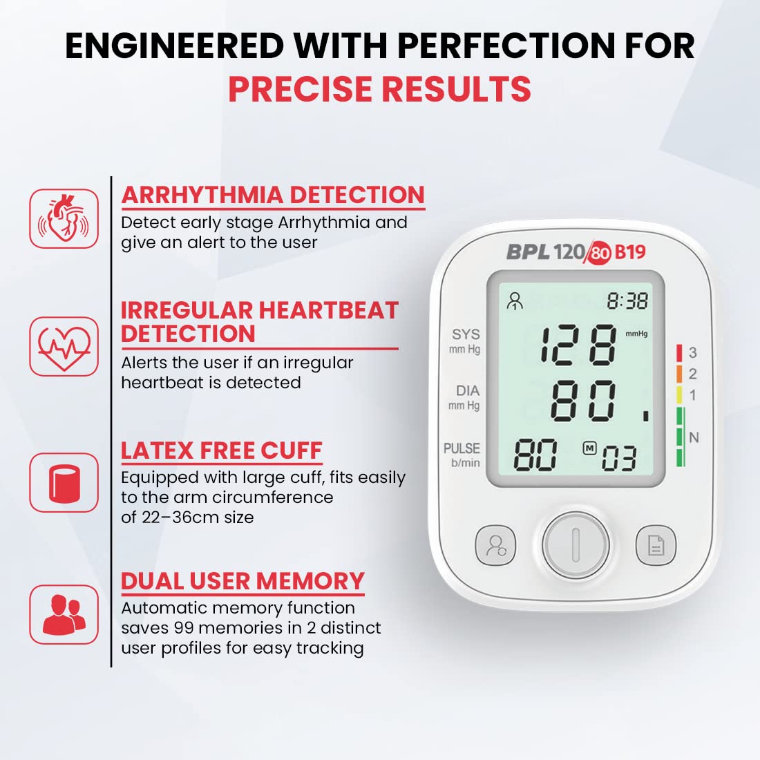 The BPL 120/80 B19 fully automatic digital blood pressure monitor from BPL Medical Technologies operates on oscillometric principle providing accurate results with the press of a button.Along with precise measurement, the device is equipped with features like Irregular heartbeat detection, Arrhythmia detection that alerts the user in cases of irregular heartbeat and early-stage arrhythmia is detected.Features like average value display eases the understanding of the blood pressure condition for the user. The dual user memory feature enables to keep a track of the blood pressure of two different users separately and can keep a record of up to 99 readings per user. A visual indication of the low battery condition would prevent the user from a getting an incorrect reading due to low battery and thereby implying to plug in to a different power source. The dual power source and a micro-USB compatibility makes it accessible anytime, anywhere. The device comes with a comfortable and easy to wear latex free cuff of 22*36 cm, 4*AA batteries and a carrying pouch.The BPL 120/80 B19 BP Monitor is warranted for 3 years against any manufacturing defects.This easy-to-use user-friendly device can be used at home for efficient tracking of the Blood Pressure of an individual.